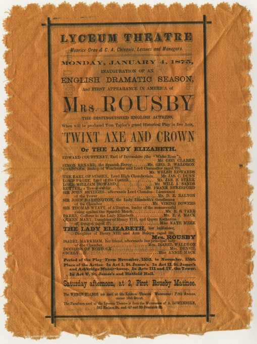 Three advertisements: Bloom's Laces and Trimmings; Weber's Piano-Fortes, and Twixt Axe and Crown with Mrs. Rousby at the Lyceum Theater