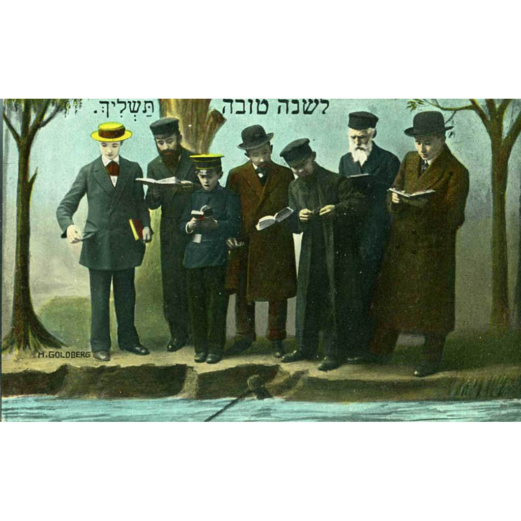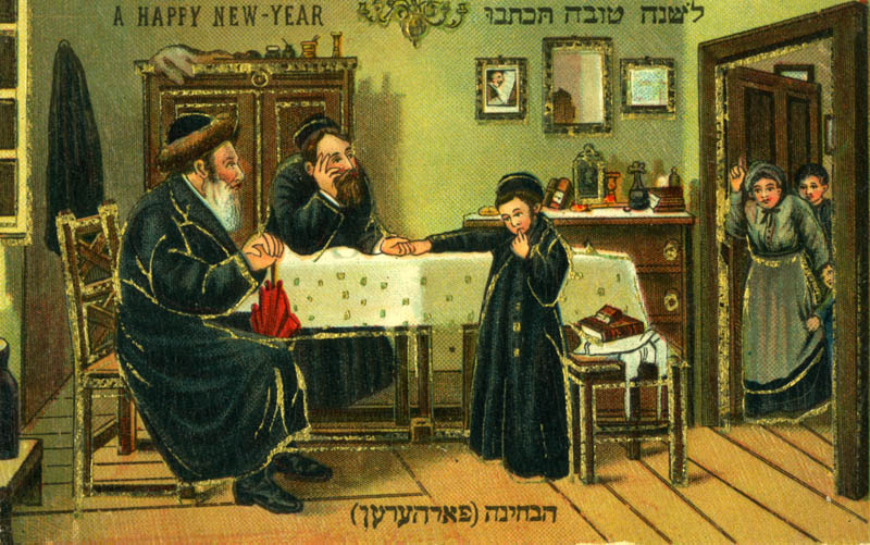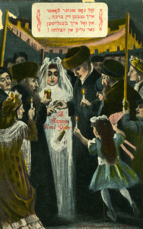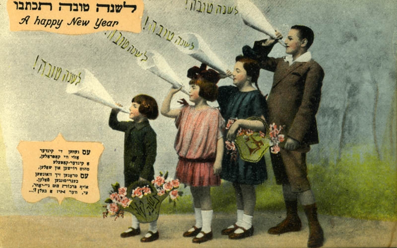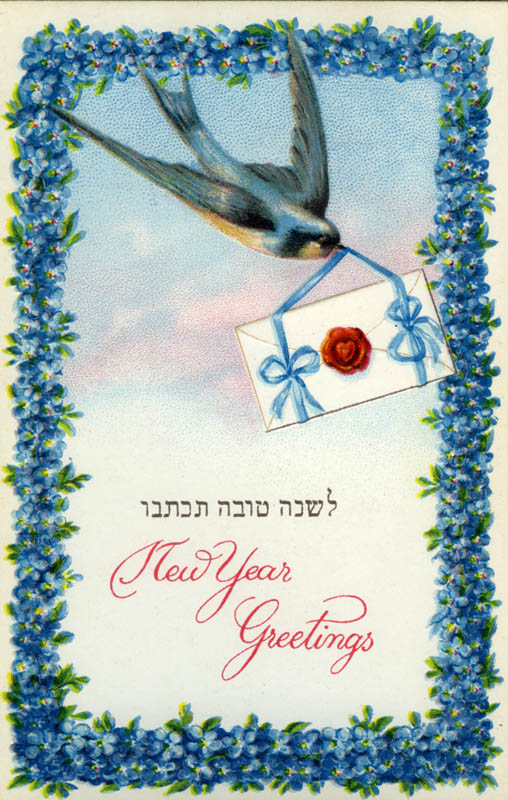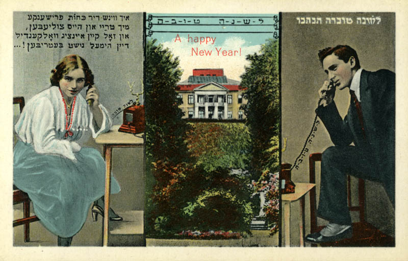 Rosh Hashanah postcard depicting a couple in a hot air balloon