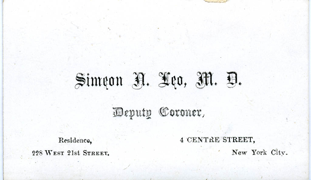 Business card of Dr. Simeon Leo, Deputy Coroner.