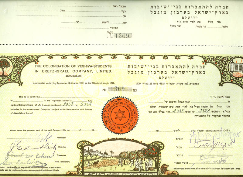 Share certificate in The Colonization of Yeshiva-Students in Eretz-Israel Company, Limited