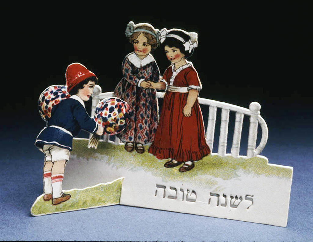 Rosh Hashanah card depicting a boy presenting bouquets to two girls