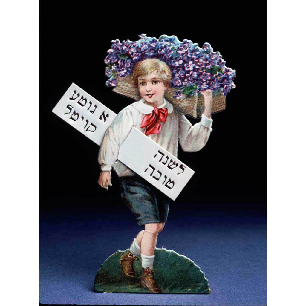 Rosh Hashanah greeting card depicting a boy holding a large basket of fviolets