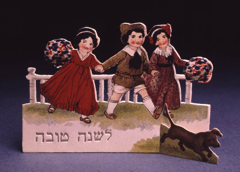 Rosh Hashanah card depicting a boy and two girls with a dog