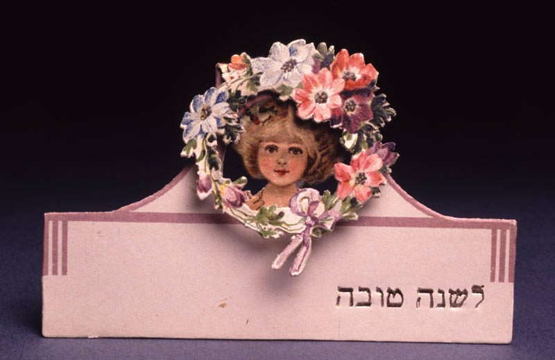 Rosh Hashanah greeting card depicting a child's head in a wreath of flowers