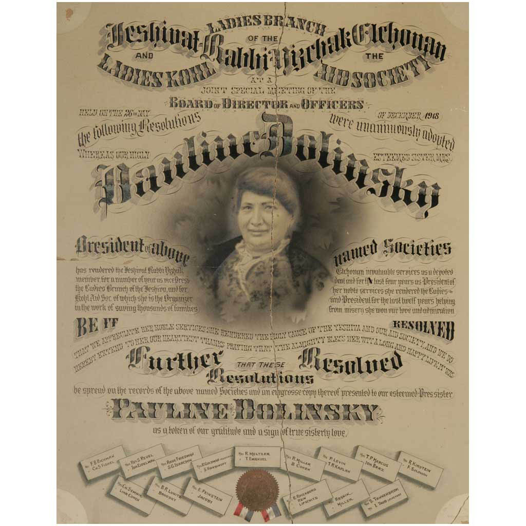 Poster announcing Pauline Dolinsky President of the Ladies Branch of Yeshivat Rabbi Yizchak Elchonan and the Ladies Kohl Aid Society