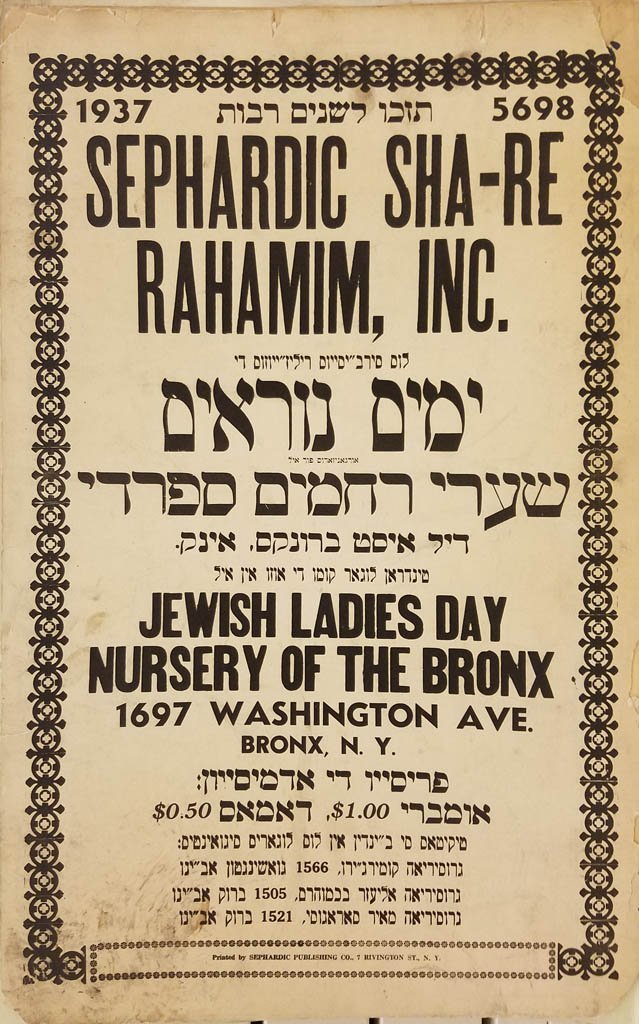 Advertisement for religious services organized for Sephardic Sha-Re Rahamim Inc. Jewish Ladies Day Nursery of the Bronx