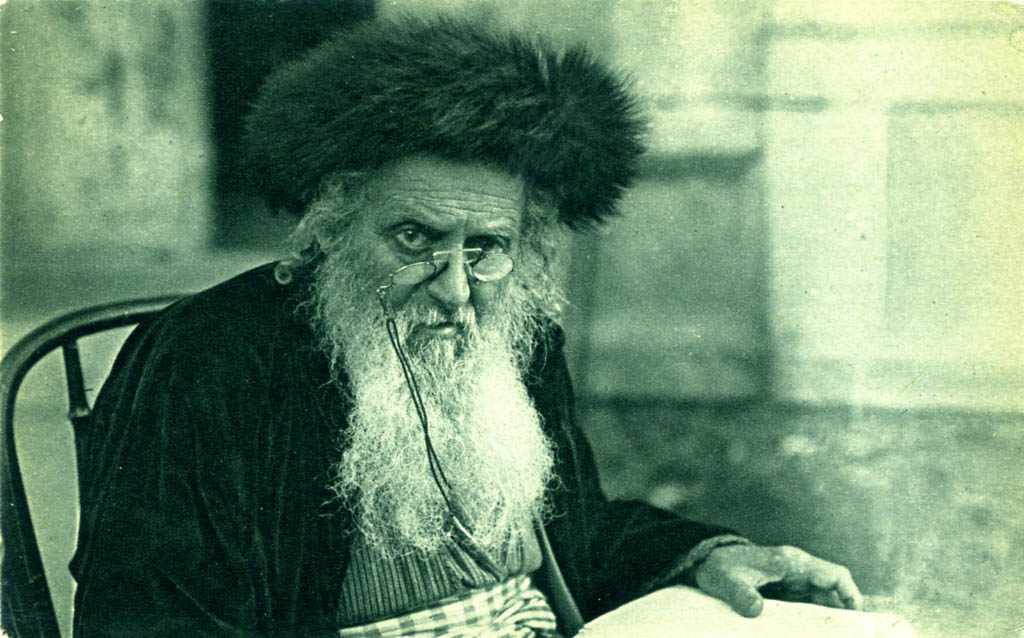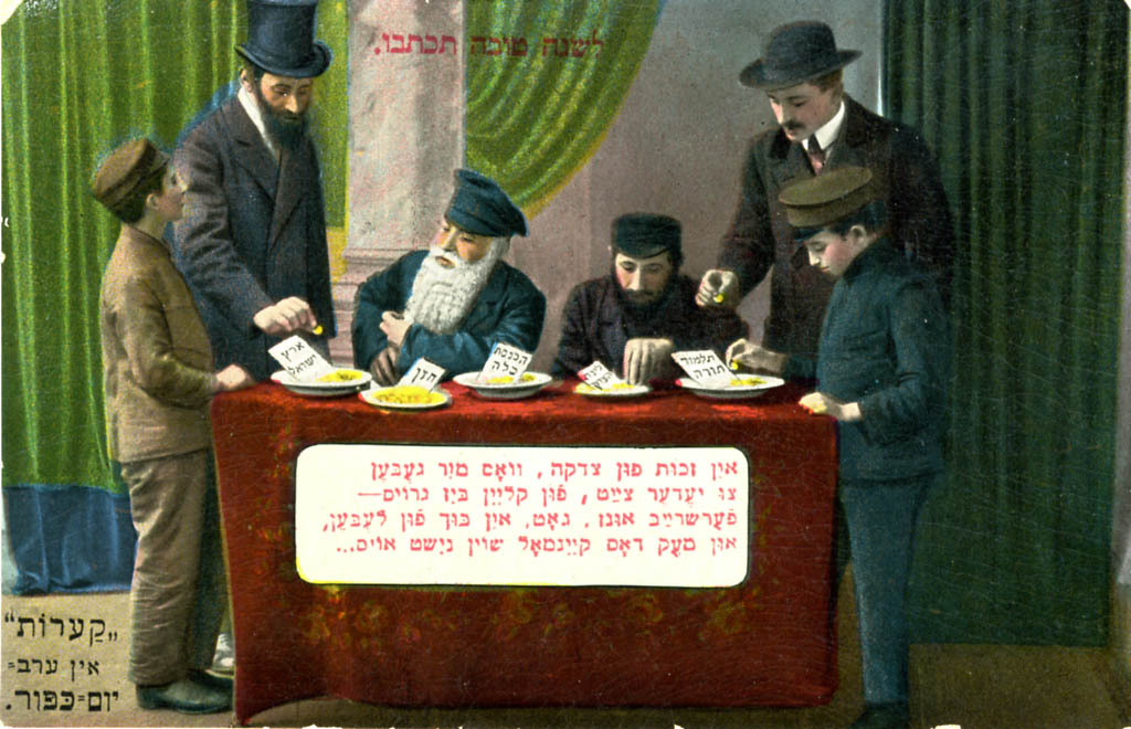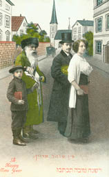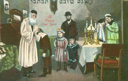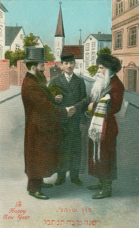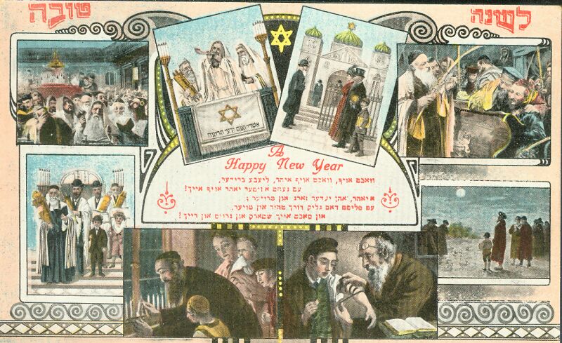 Rosh Hashanah postcard depicting two men, one blowing a shofar