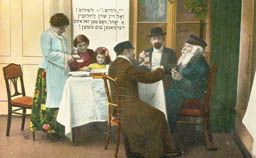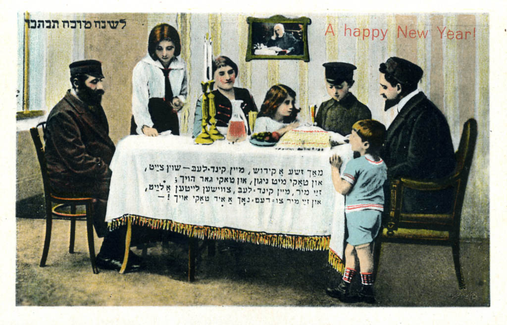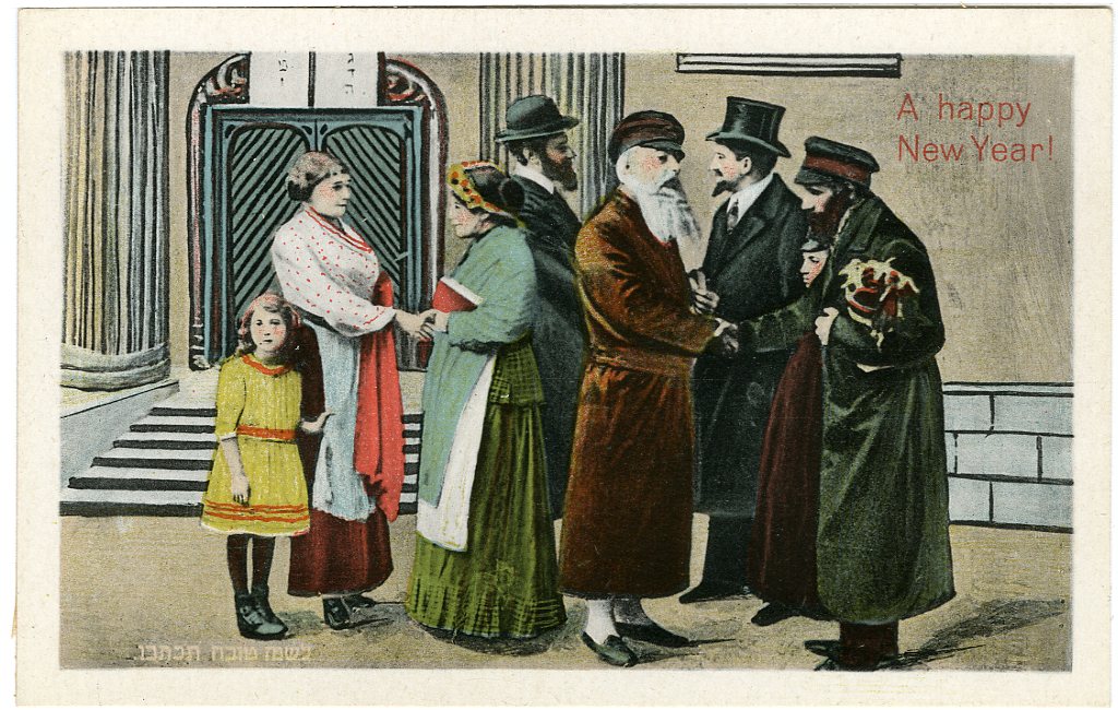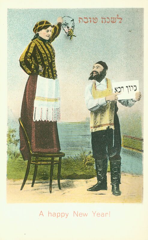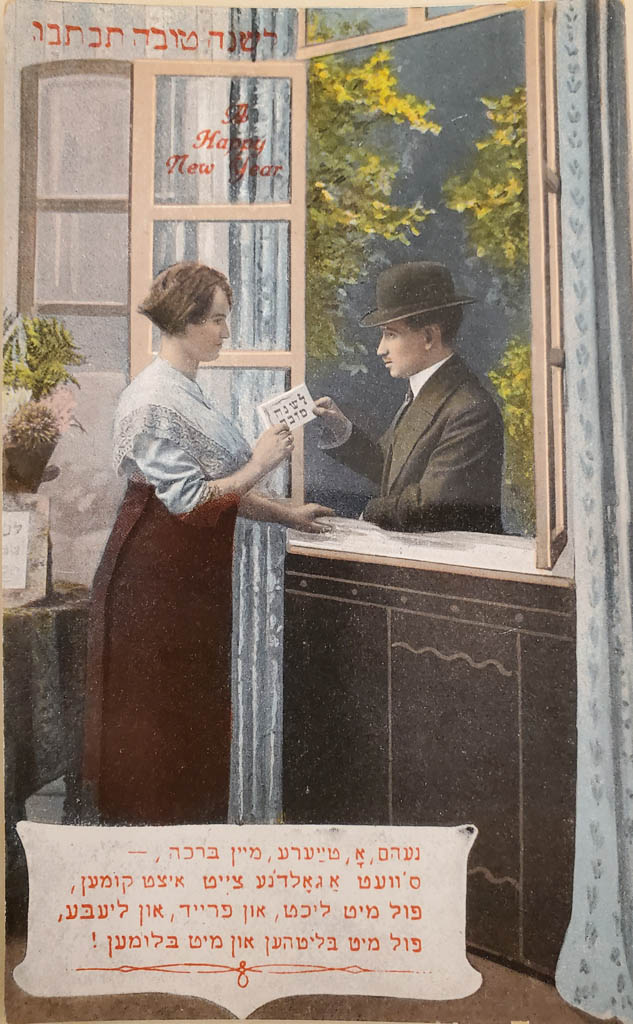 Rosh Hashanah postcard depicting a man presenting a Rosh Hashanah card to a woman,