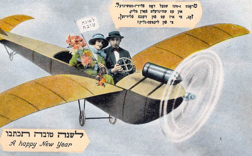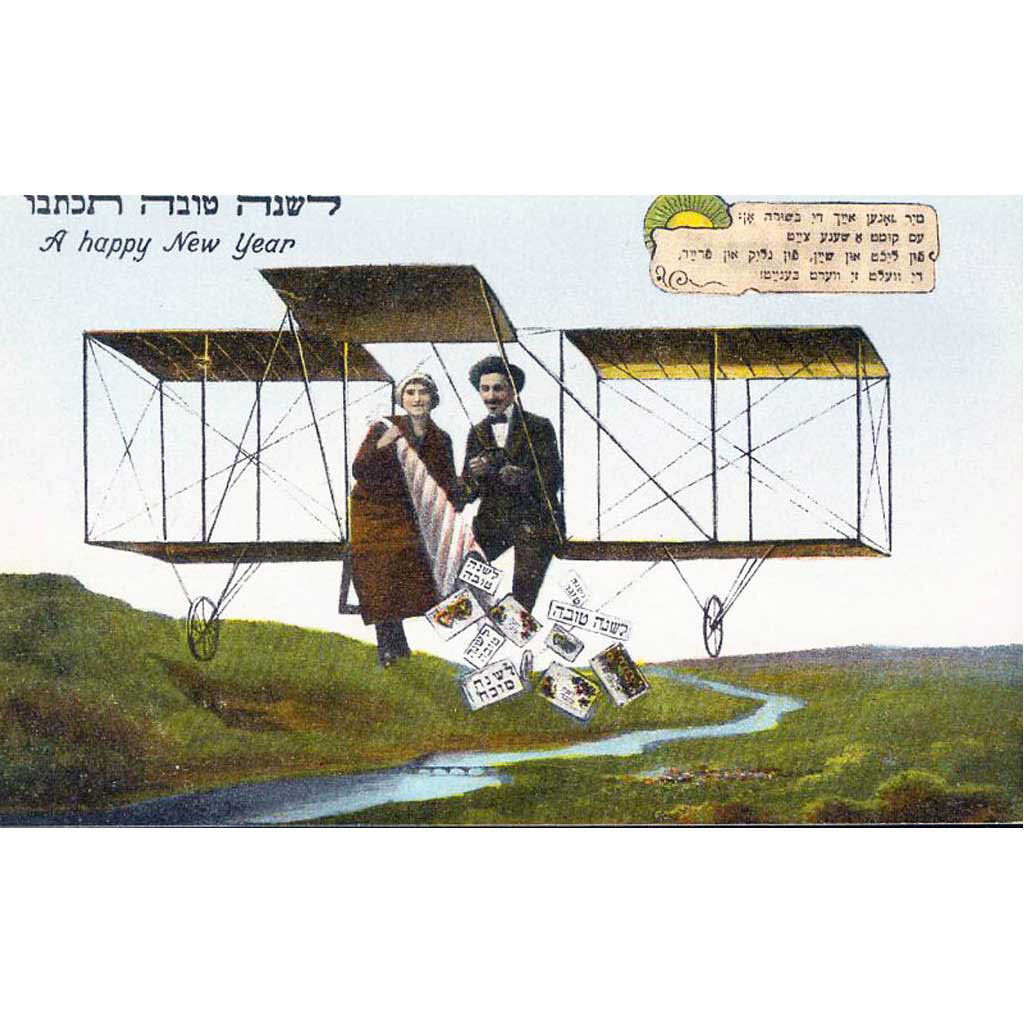 Rosh Hashanah postcard depicting a man and woman flying an early plane from which they drop holiday greeting cards
