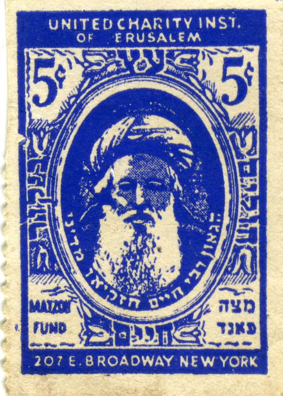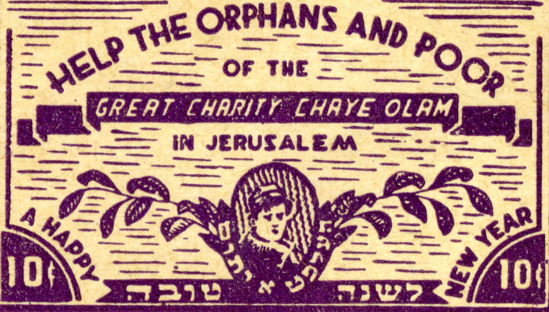 charity stamp issued by the Great t Charity Chaye Olam in Jerusalem to benefit orphans and matzah fund