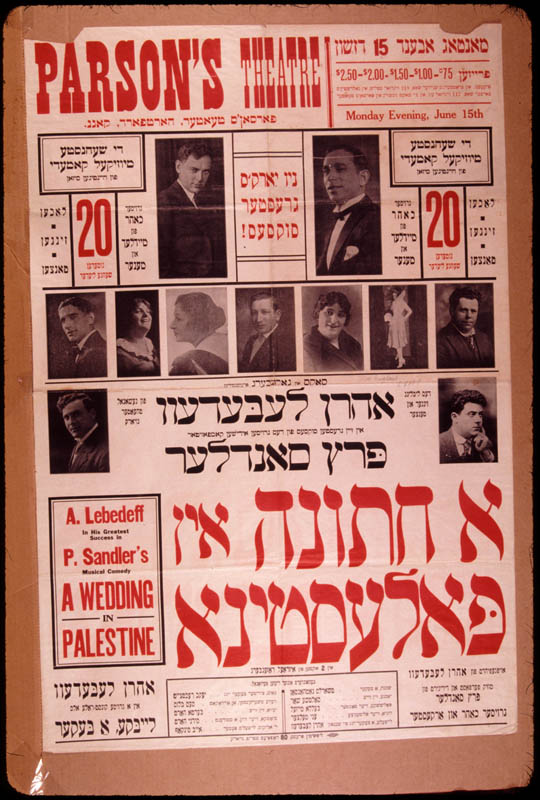 New York theater placard for the Yiddish musical, A Wedding in Palestine