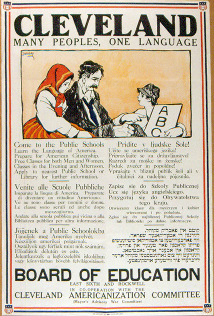 Poster appealing to people of Cleveland to attend free evening English classes produced for the Americanization Committee of the Cleveland Board of Education