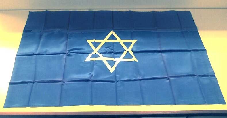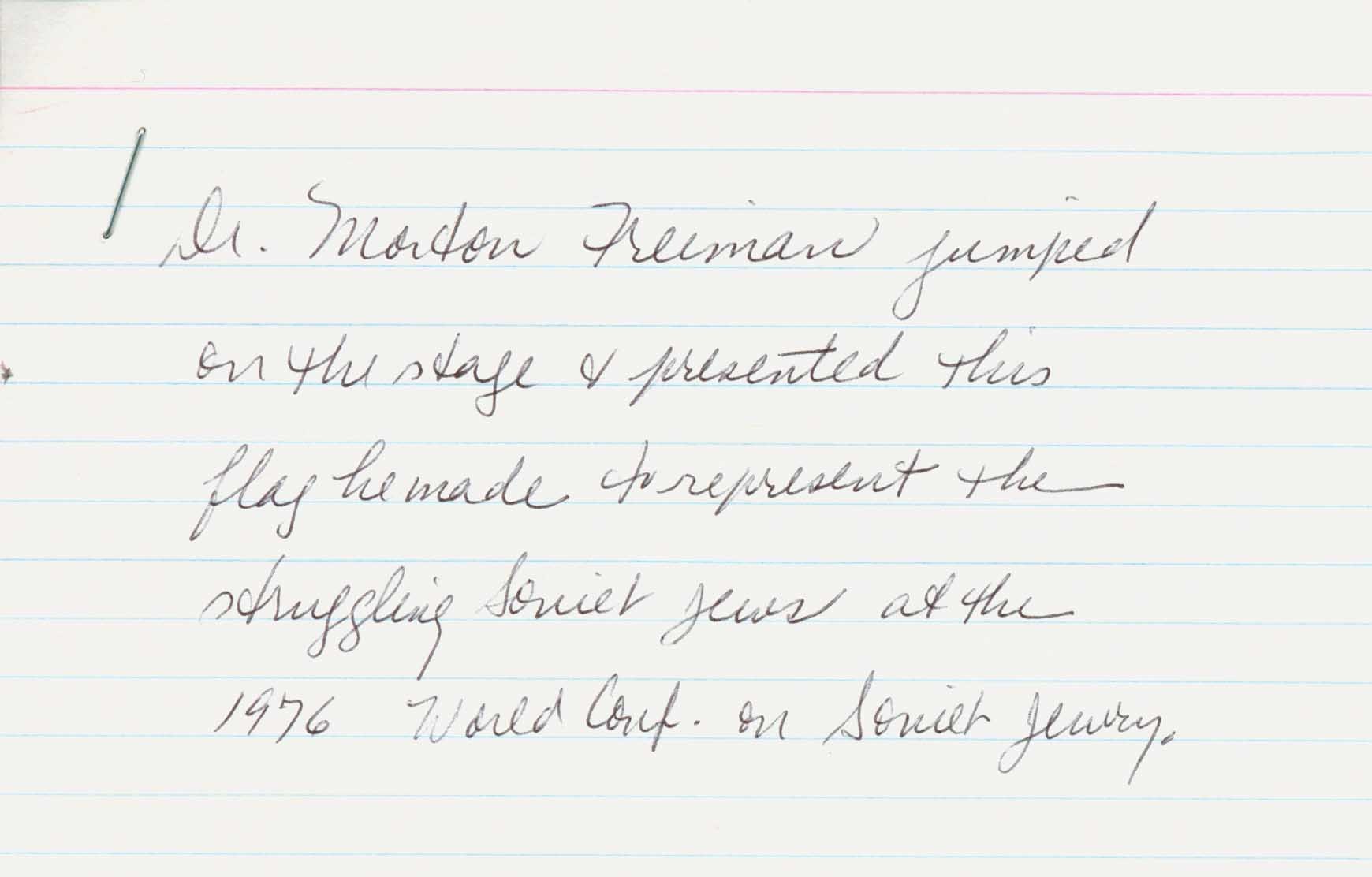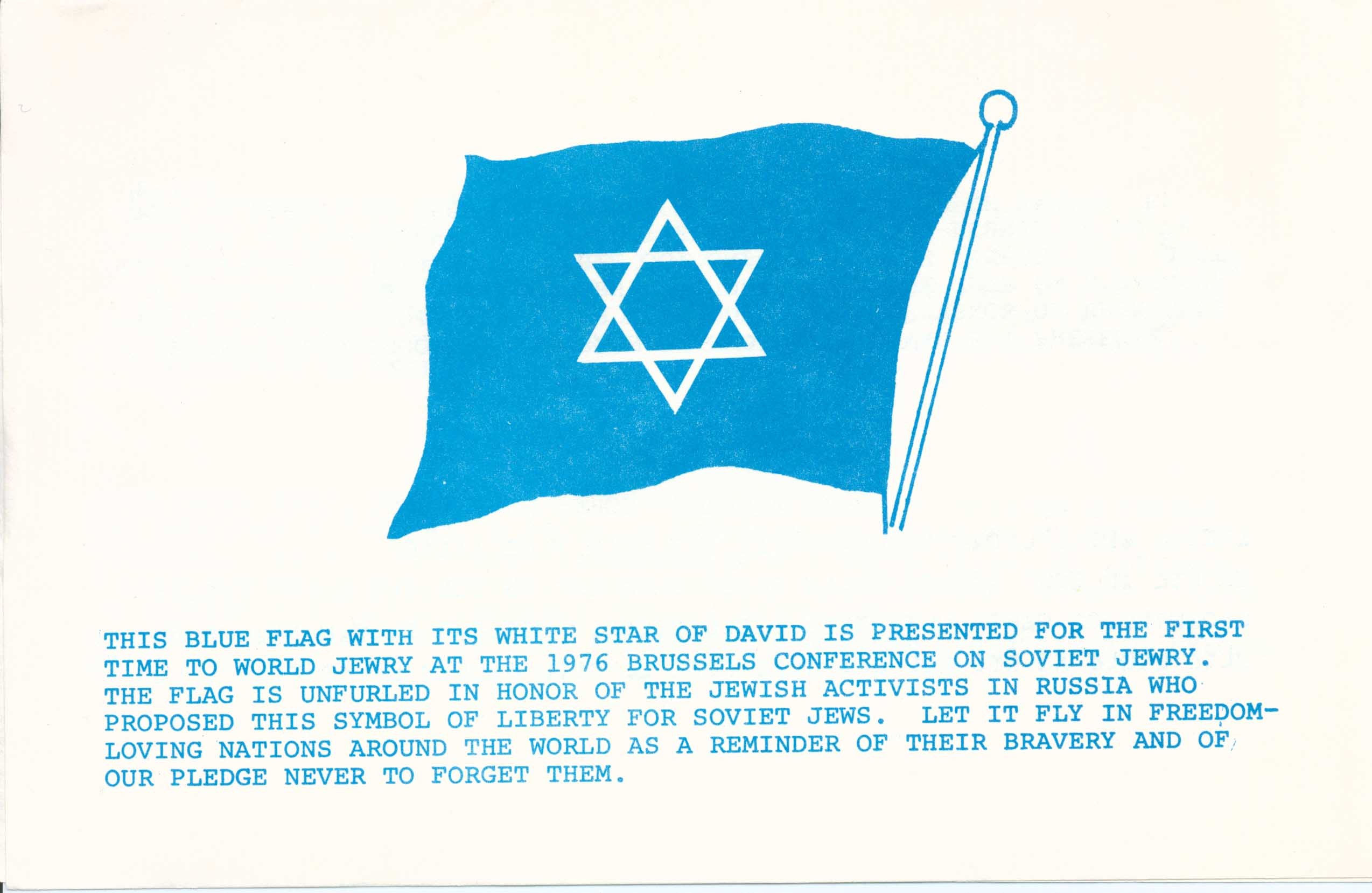Blue flag with white Star of David, presented by Morton Freiman Brussels Conference on Soviet Jewry as a proposed symbol of liberty for Soviet Jews, 1976 |