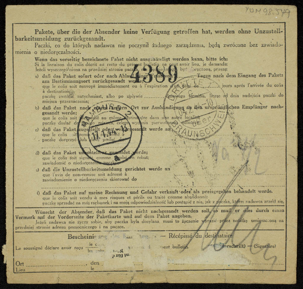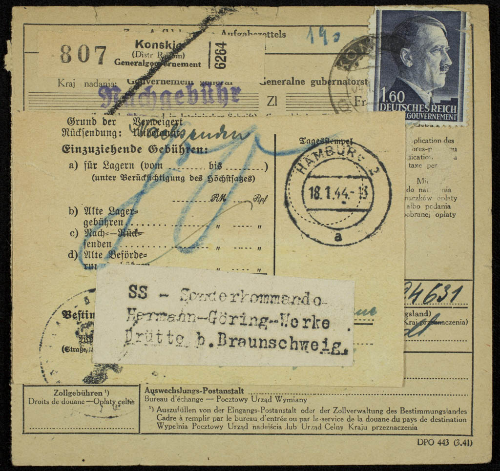 Notice of postage due on package sent from the General Government of Poland to Wiktor Stolanski (?) of the SS |