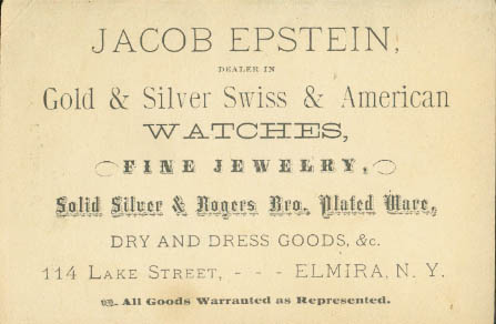 Advertising card for Jacob Epstein Jewelry, Watches and dry and dress goods |