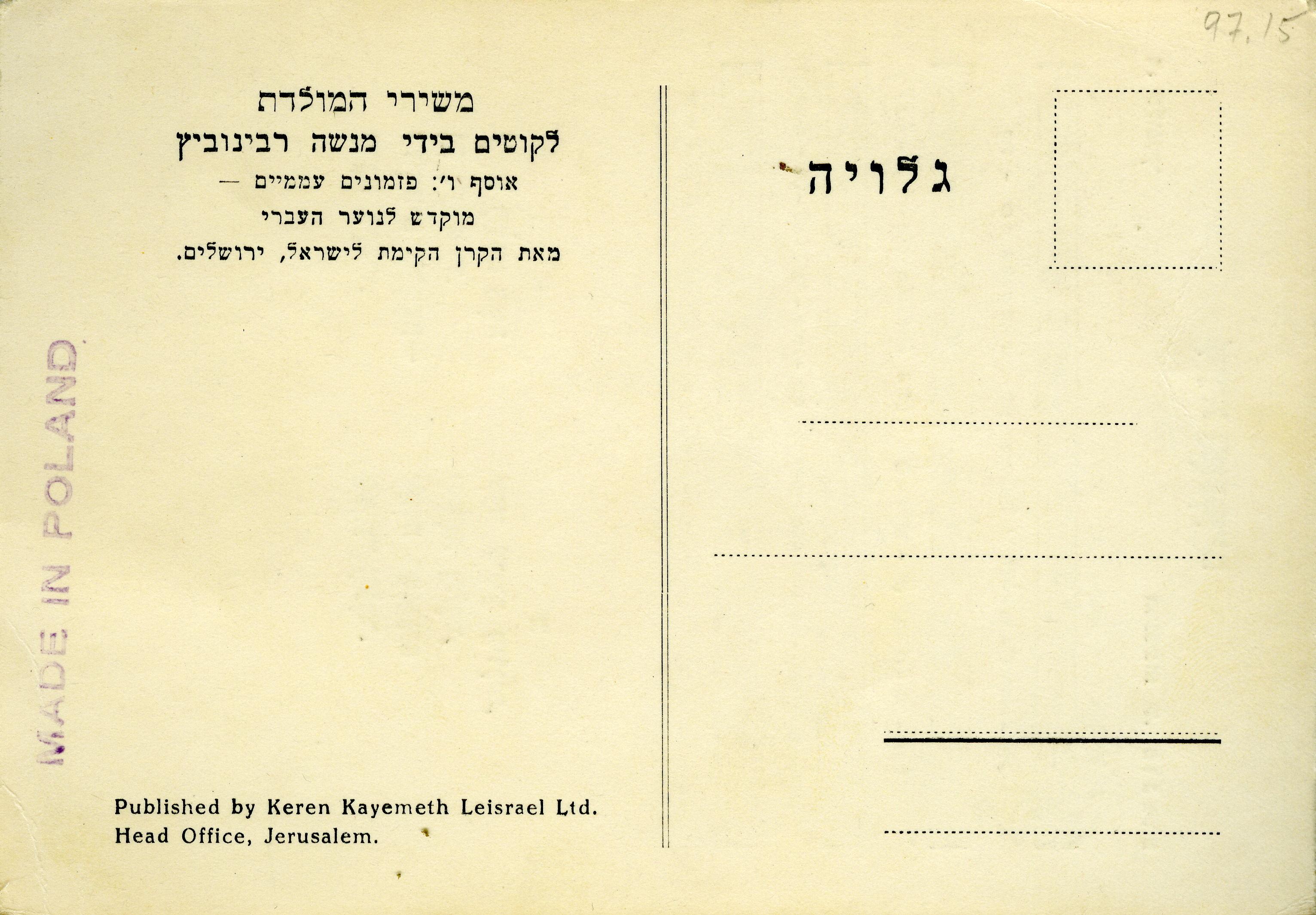 JNF postcard: Shirat Hamamireym |