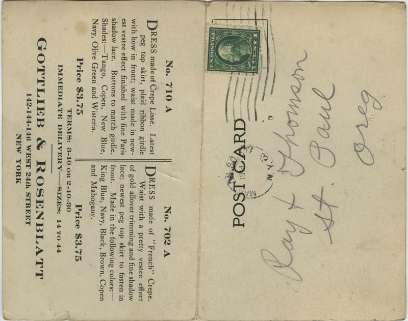 Postcard advertising Gottlieb & Rosenblatt women's spring dresses |