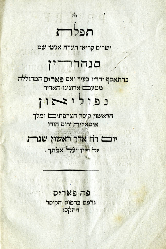 Prayer of the members of the Sanhedrin: recited in their assembly in Paris on the 1st day of Adar in the year 5567 (February 9, 1807) (Hebrew and French)(9 février 1807) |