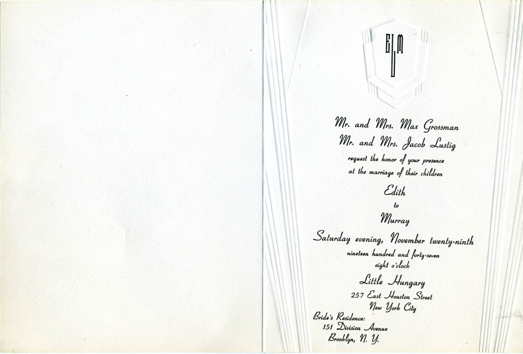 Wedding invitation of Edith Grossman and Murray Lustig |
