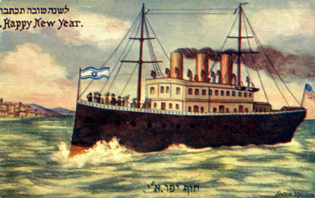 | Title: | Rosh Hashanah postcard depicting a ship flying American and Israeli flags |