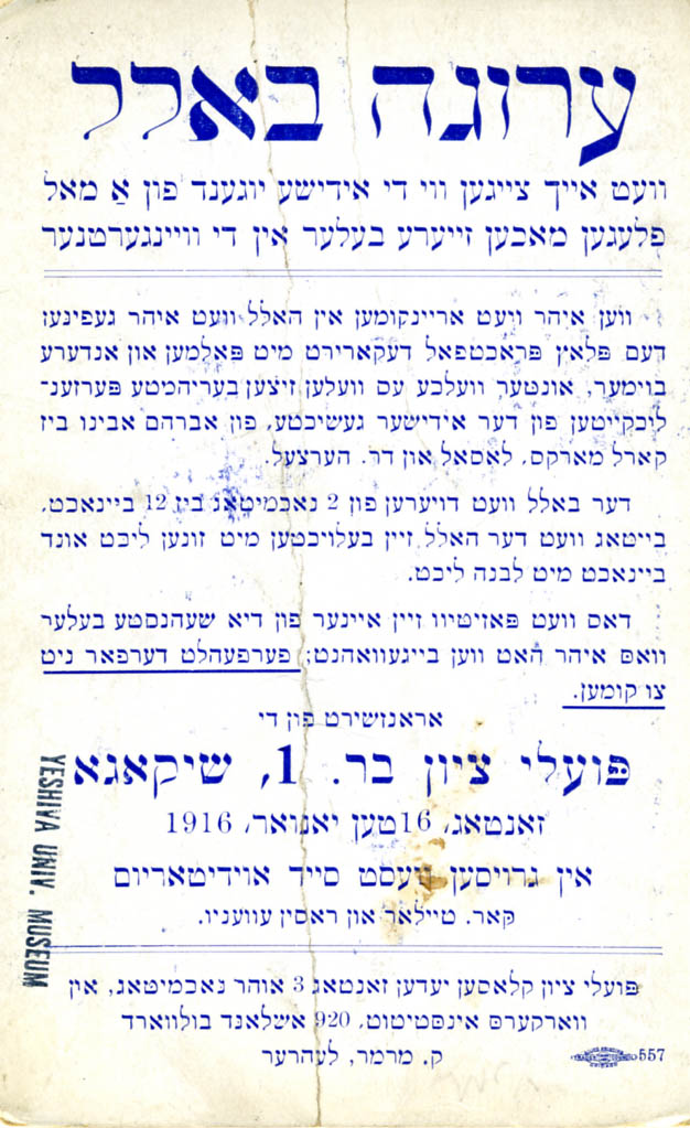 Advertisement for a ball sponsored by Poale Zion of Chicago Sunday January 16, 1916 |