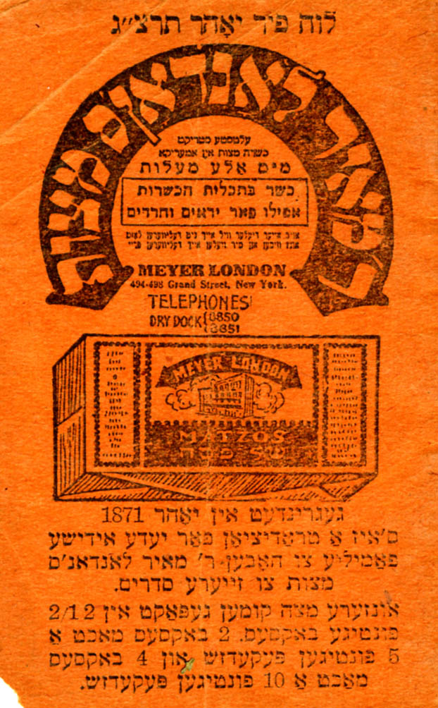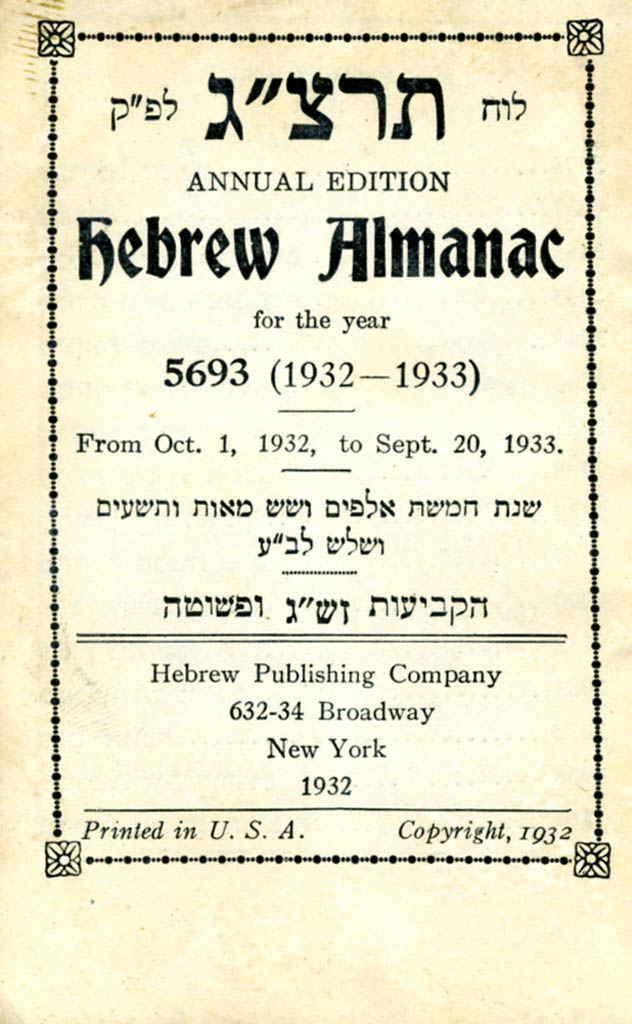 Hebrew Almanack for 5693 (1932-1933) issued by Meyer London's |