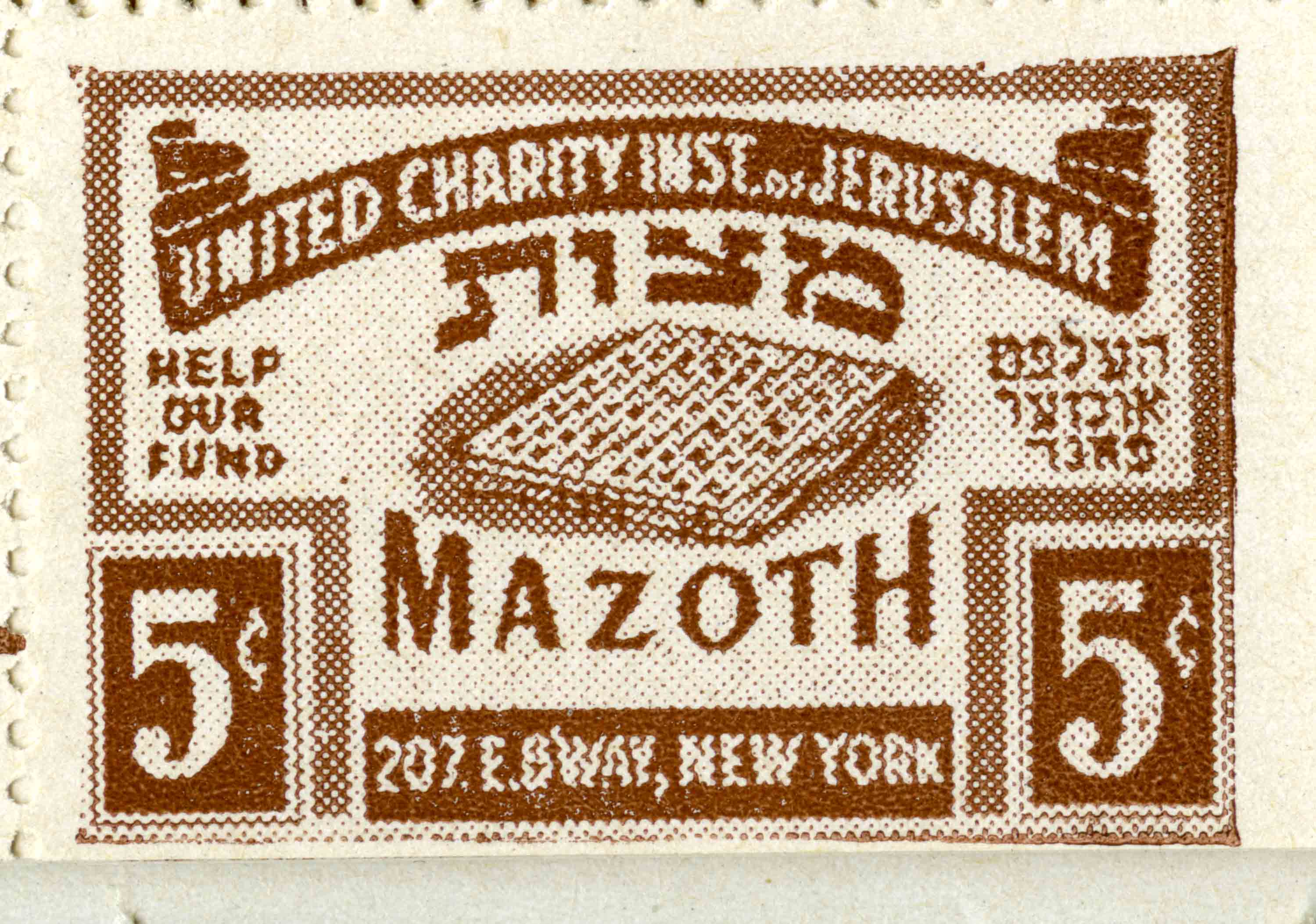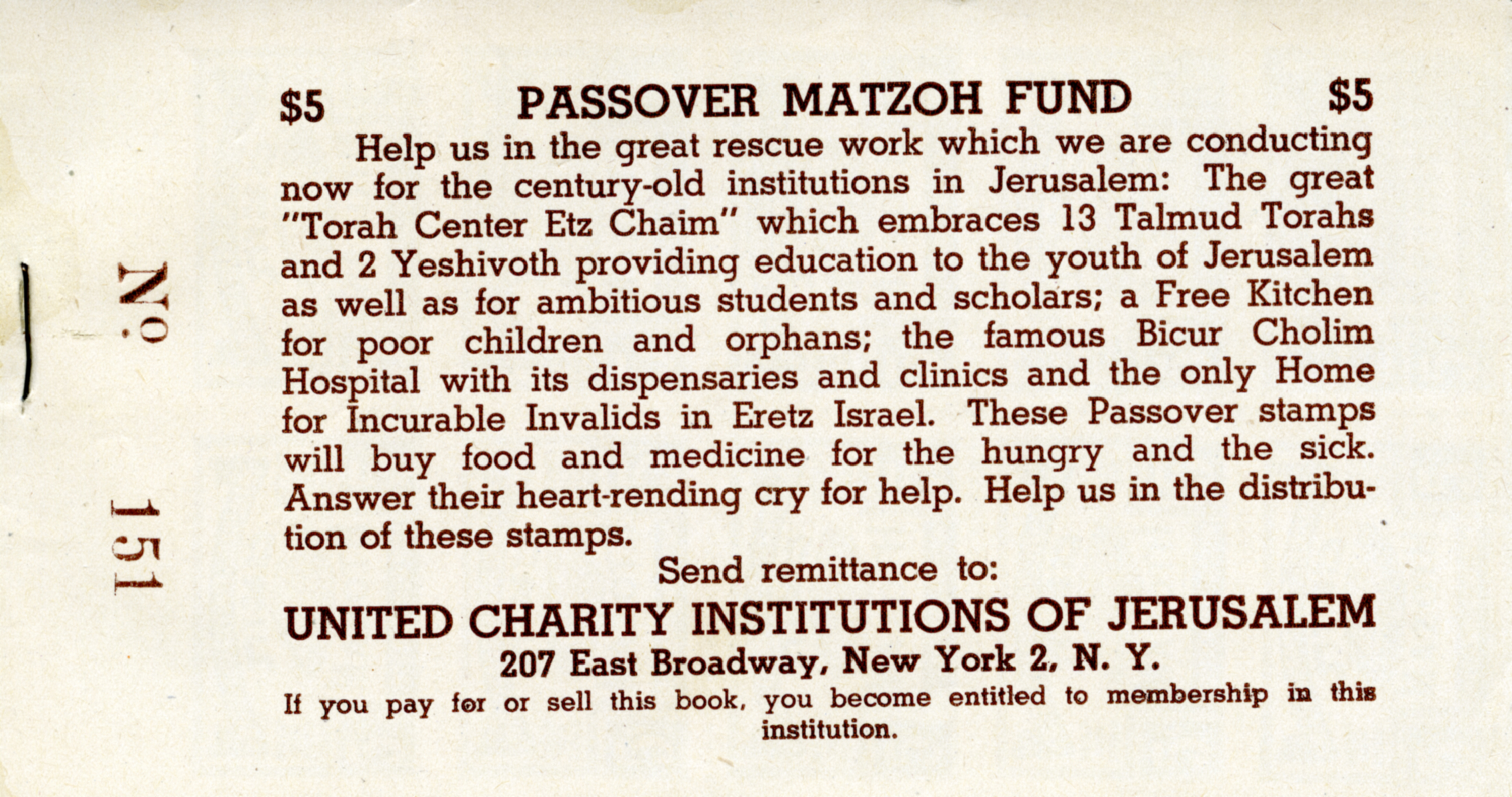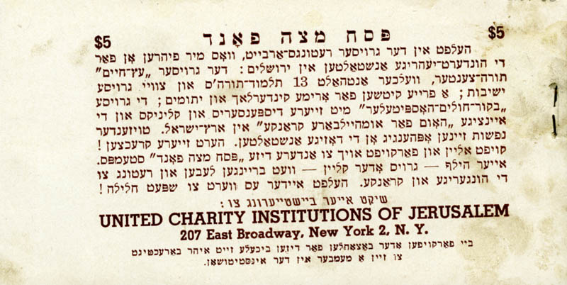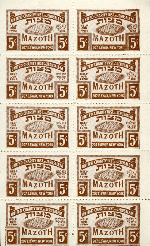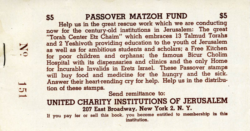 Booklet of charity stamps for the United Charity Institutions of Jerusalem Passover Matzoh Fund |
