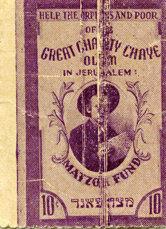 charity stamp issued by the Great t Charity Chaye Olam in Jerusalem to benefit orphans and matzah fund |