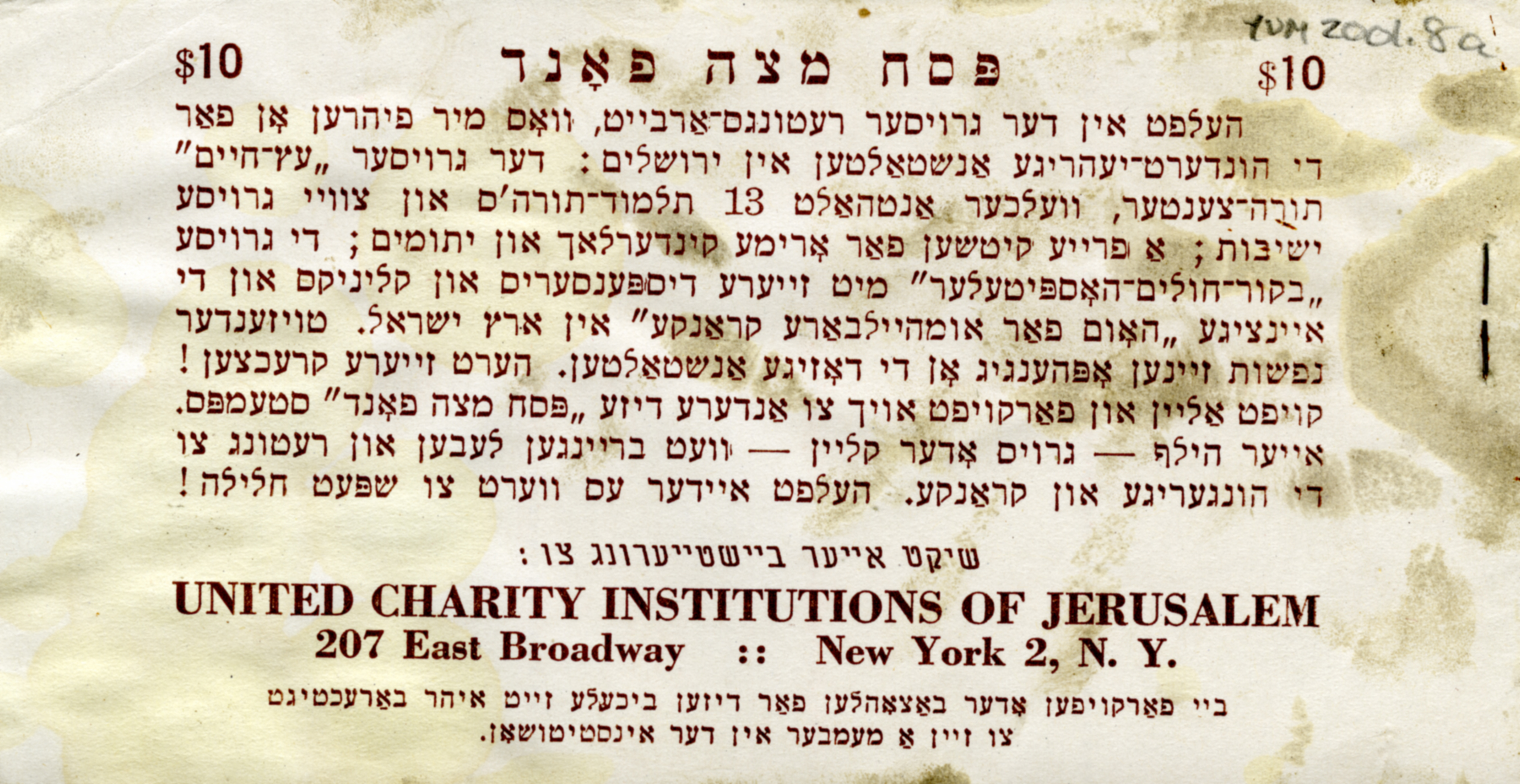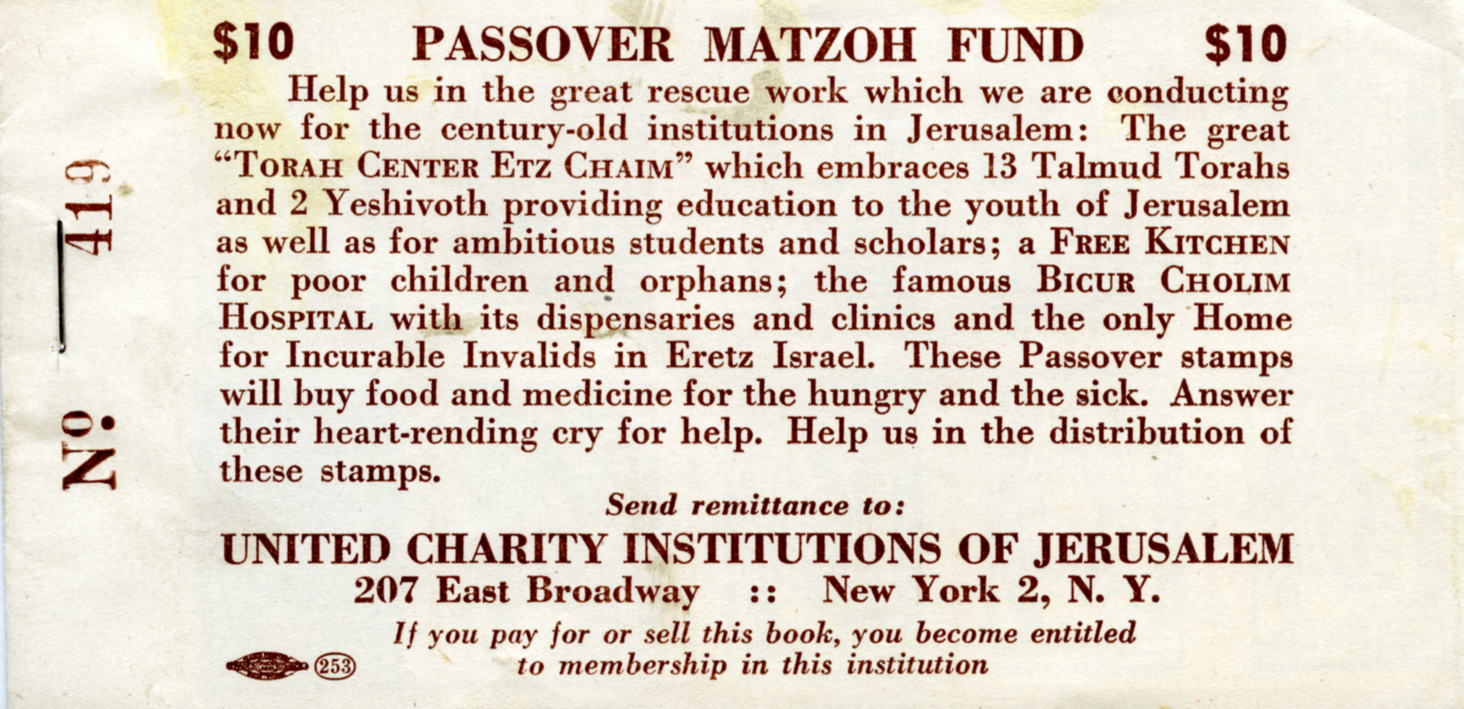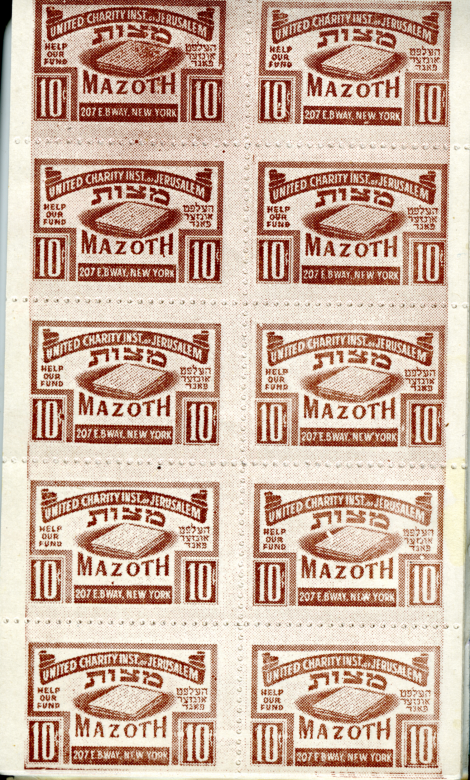 Booklet of charity stamps for United Charity Institutions of Jerusalem matzah fund |