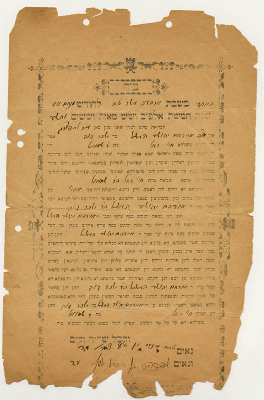 Marriage contract of Abraham Joshua Heschel, son of Issachar David and Chaya Rachel, daughter of Schmuel (ketubah) (ketubah) |